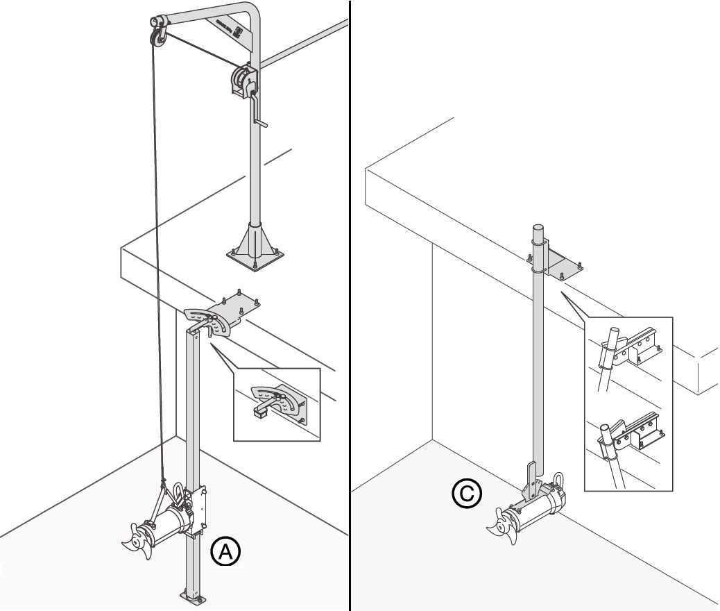 A meglévő berendezésekkel is kompatibilis futóművel felszerelt keverő egy négyszögletes oszlopon csúszik, és a robusztus emelőkaroknak köszönhetően a tartály leeresztése nélkül eltávolítható.